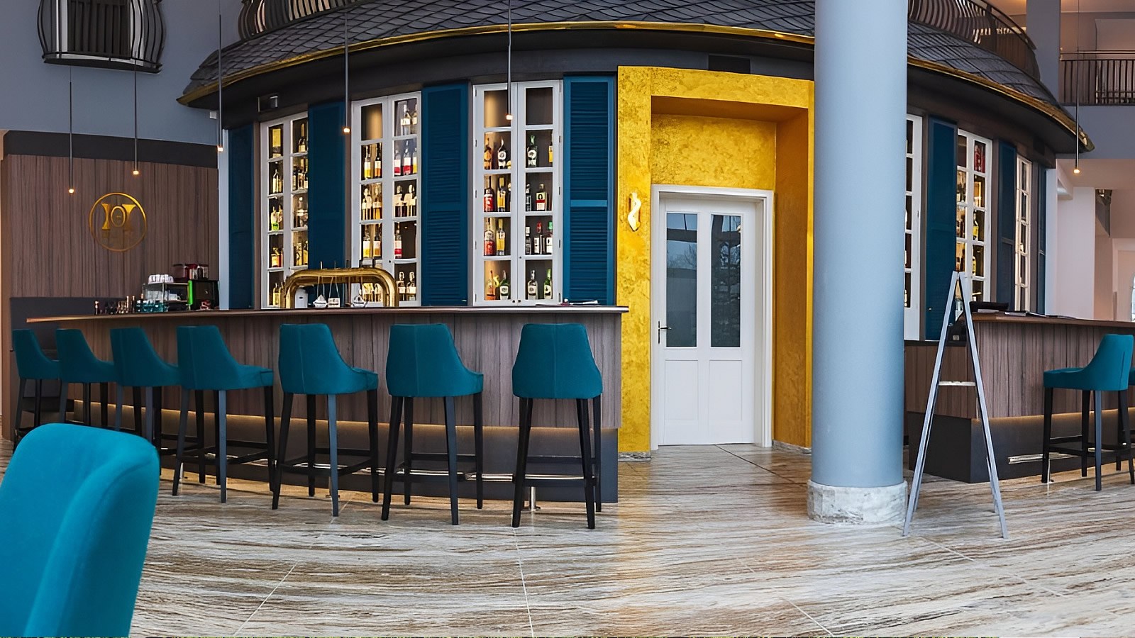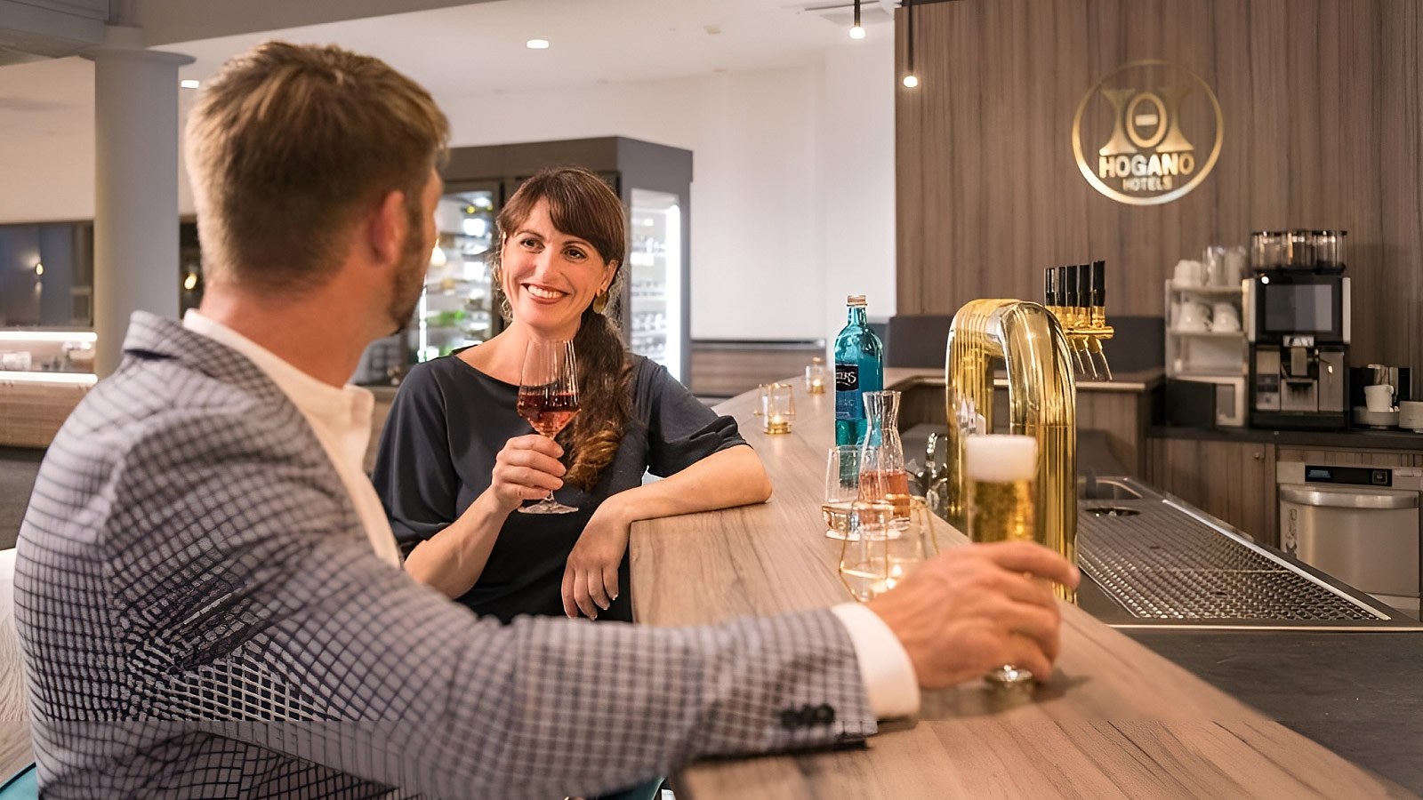 Die Bar & Lounge bietet einen gemütlichen Treffpunkt. Hier können Sie den Tag z.B. bei einem leckeren Getränk am Kamin ausklingen lassen. Zweistöckige Fenster eröffnen einen Blick nach draußen ins Grüne.