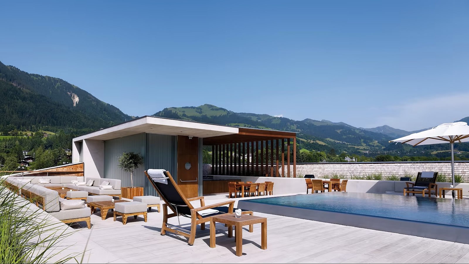 Das Hotel begeistert mit einem großzügigen rund 1.500 qm großen Spa- und Wellnessbereich mit Indoor-Pool, Saunen und Beauty-Anwendungen. Ein Highlight ist der spektakuläre Dach-Pool mit Panoramablick über Kitzbühel - einer der schönsten Rooftop-Pools der Region.