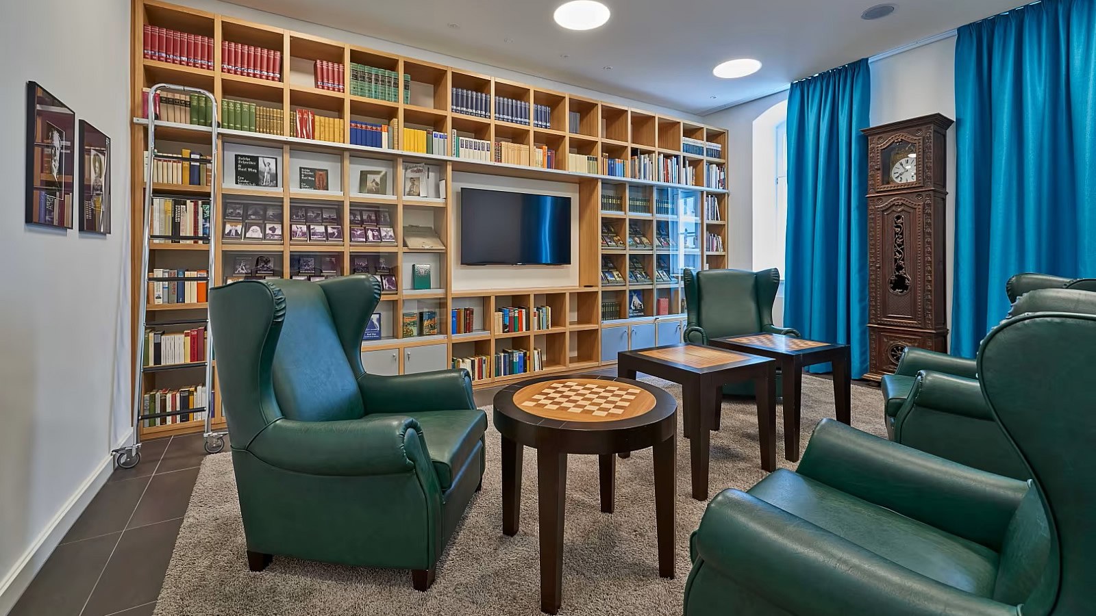Der Geist des Hauses atmet Kunst. Gemälde von Dirk Sommer mit zeitgenössischem Galerie-Flair. Ledersessel zum Darinversinken in der Karl-May-Bibliothek. Radierungen von Arthur Henne im gleichnamigen Salon. Faksimile von Karl May Bänden mit Titelzeichnungen von Sascha Schneider (Dresdner Maler), Originalausgabe der gesammelten Werke in der Fassung von 1954 - erschienen im Karl-May-Verlag Bamberg sowie Schriften zur Neubewertung der Werke aus 2012.